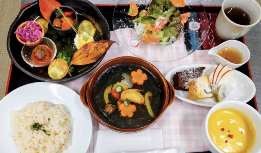 黒カレーの中に色とりどりの野菜が浮かび、秋の森を思わせるような一皿。