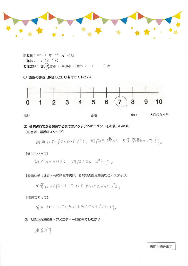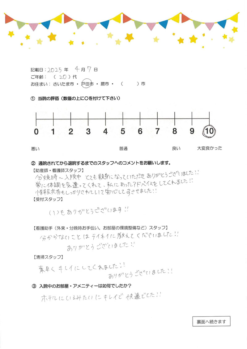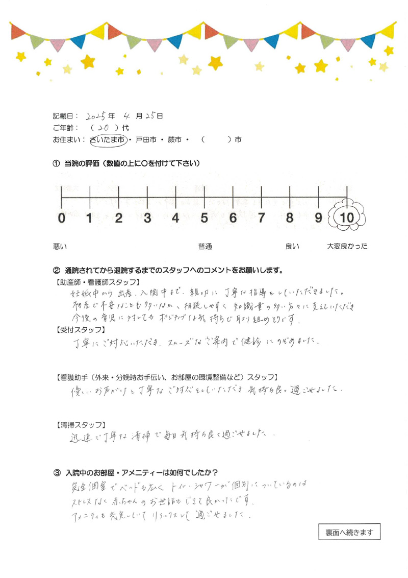 ローズマタニティクリニックでご出産された方々に、アンケートのご回答をいただきました。当院では、さいたま市の他、戸田市、蕨市、川口市より多くの妊婦さんにお越しいただいております。これからもより多くの方々が安心してご来院・ご出産(分娩)いただけるよう、スタッフ一同努めてまいります。