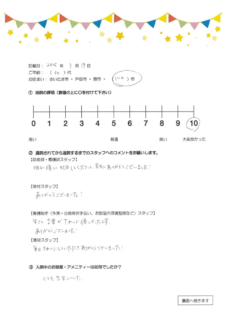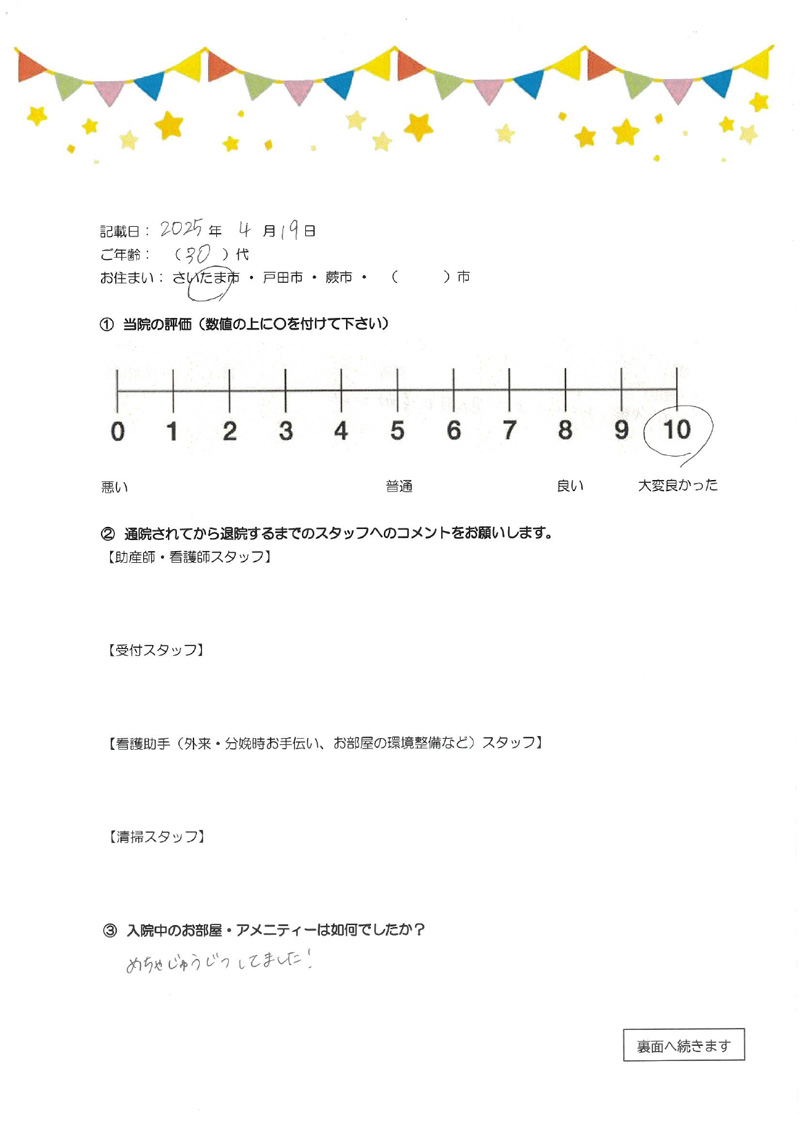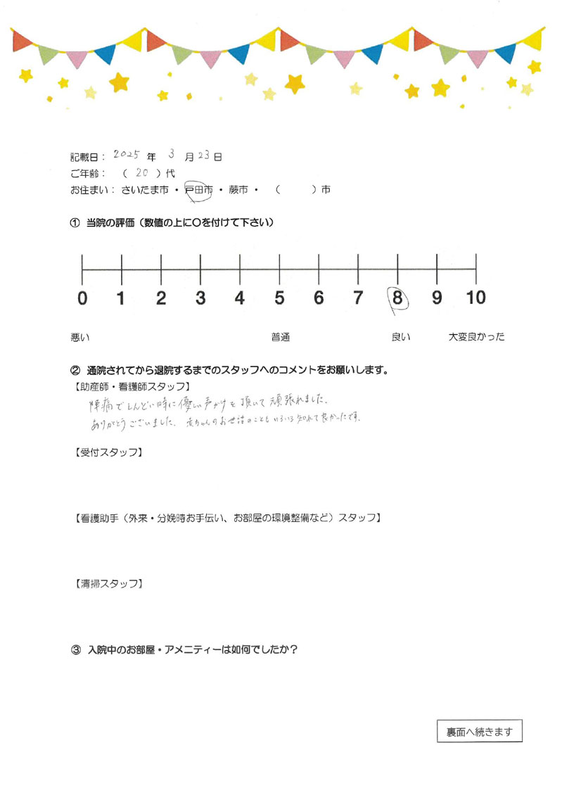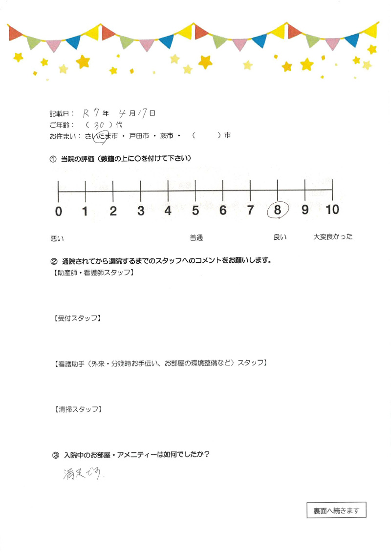 ローズマタニティクリニックでご出産された方々に、アンケートのご回答をいただきました。当院では、さいたま市の他、戸田市、蕨市、川口市より多くの妊婦さんにお越しいただいております。これからもより多くの方々が安心してご来院・ご出産(分娩)いただけるよう、スタッフ一同努めてまいります。